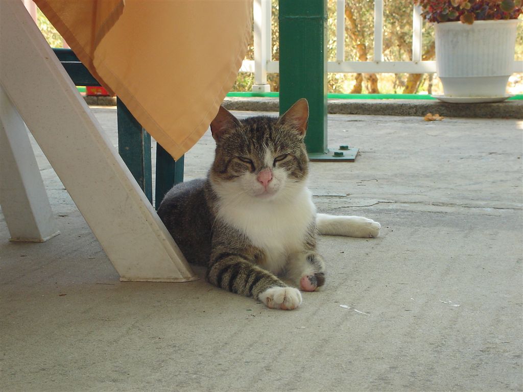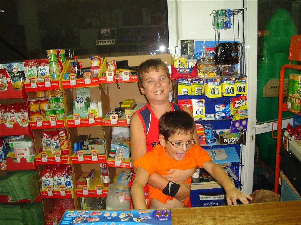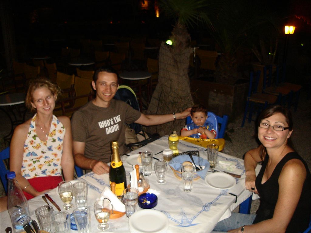 The roads in Sami are a little crazy and I almost navigated the car down a flight of stairs, good thing Demetri is actually driving. 4 km north east of Sami is the Antisamos beach. This is a large stony beach. The water was very calm and clear and probably the best beach for kids we saw all trip. Beware of the 3€ parking sign as there is a free public lot 50 yards further. Now we are on the hunt for a hotel in the southern end as we plan to catch the ferry to Zakynthos tomorrow. We were unimpressed with the capital and found the selection near Gialos beach over priced. We found a studio on Lourdata beach where we tried to snorkel but it was too stirred up. The next day we drove to Pesada to double check the ferry schedule. There is no ferry until 5:00 so we have the day to explore. Unfortunately the Kastro was closed since it was a Monday but we drove over the hills towards the Gerasimou monastery. The church looks quite new and was probably built after the 1953 earthquake. The carvings inside were very elaborate as white marble replaces the wood usually seen around the alter. Just behind the church is a co-op for Kefalonian wine. We snuck in for some tasting just before the tour bus arrived. The Kefalonian Robola is an award wining white wine but we took home a sweet red liquor wine similar to port. After, we found out from relatives near Demetri’s village that the some Greeks do not like the Robola (too bland) and that when they try a wine they do not like they jokingly refer to it as a Robola. OK enough sips of wine for Demetri and we are heading for the ferry. This time the ferry ride was uneventful and in the non smoking section (yeah first time I saw a non smoking section in Greece) we met a nice Greek/Canadian couple. Nick is from Edmonton with family in Zakynthos and his girlfriend Jamie is from Ottawa.