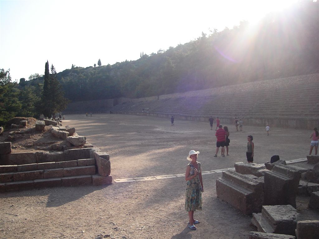 Delphi http://en.wikipedia.org/wiki/Delphi was considered by some to be the center of the earth. This site is famous for the Oracle who was consulted in ancient Greek times by world leaders among others. Her predictions were in the form of riddles and left open to interpretation. Today we enjoyed the museum, were memorized by how the bricks are locked together and by the text written and re-written on the stone over the ages. The most impressive was the Stadium hidden at the top of the site. This was the site of the second most important games and retains the seating for over 6000 spectators. Since it was extremely hot, even at 7:30 in the evening, we did like the ancient athletes and splashed ourselves in the Castalian springs located at the base of the site. Demetri has seen many Greek ruins and was very impresed with this site.